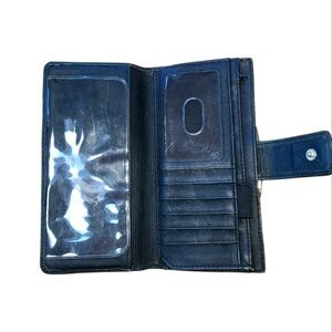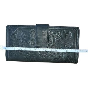 Fossil black leather wallet. Beautiful floral embossing on front. Snap closure.