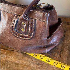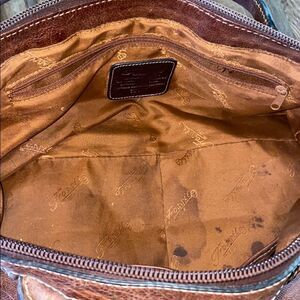 This is an older bag. Very sturdy and great leather. It has marks on the inside. The marks on the outside make it look even better. It sort of looks like a small duffel bag. Strap drop is 9”