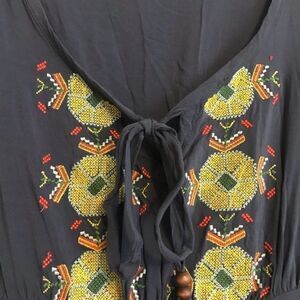 Perfect for summer! Embroidered neckline and hem. Ruffle at bottom. Cinched back with side zipper. Tie front neck with wooden beads. Nice quality!