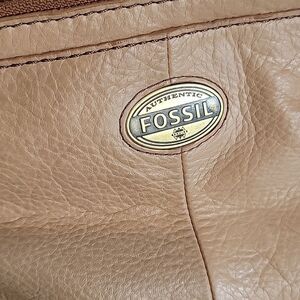 Beautiful soft leather crossbody by Fossil with contrasting brown stitching, adjustable strap with bridal leather accents, and a top zip closure with two outside zip pockets. Good pre-owned condition with normal signs of use, including one dark mark on the front and some leather discoloration by the zipper. See pictures.