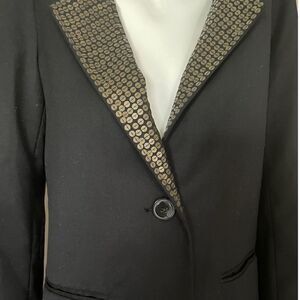 Sleek and classy. 50% modern, 50% vintage. Gold sequin lapel. One button closure. Front well pockets. Slit in back.
