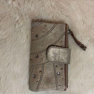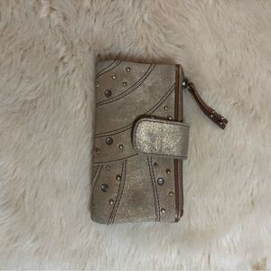 This Fossil wallet combines a sleek gray and brown color palette with an edgy studded design, offering a stylish and functional accessory. Crafted with attention to detail, it features a structured rectangular shape and a secure front flap closure. Perfect for adding a touch of sophistication to any outfit.