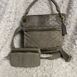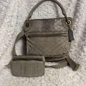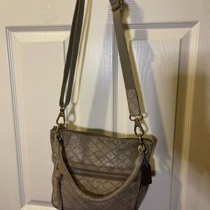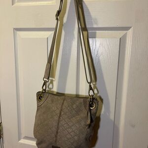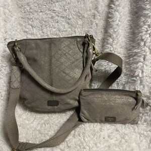 Fossil Kari leather suede gray shimmery hobo bag.brass hardwares.matching pouch