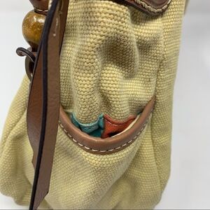 Fossil canvas shoulder bag with outside side pockets and tassel detail. Multiple inside compartments. No rips or stains.