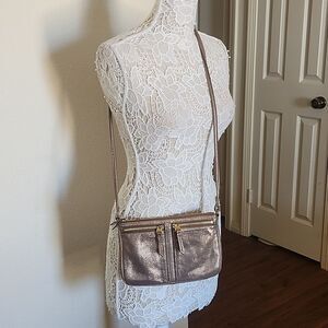 Metallic copper color, with a 22" strap drop. Buttery soft leather. very cute! Coach1.4221