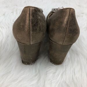 Fossil leather heels in metallic bronze size 8. Muted silver buckle toe detail and slip on design. Block 3 1/2” heel. Leather insole. Key accent on sole. Few marks on toe and heels but overall in very good condition. Sole shows typical wear. So cute on!