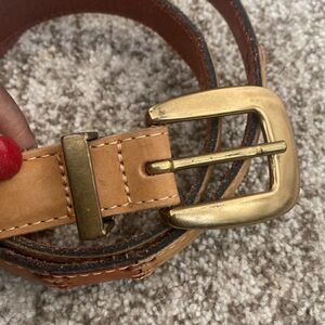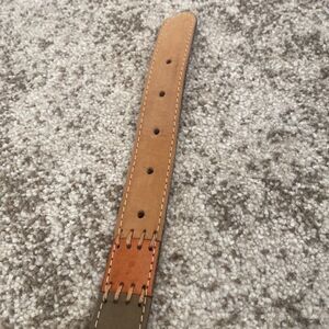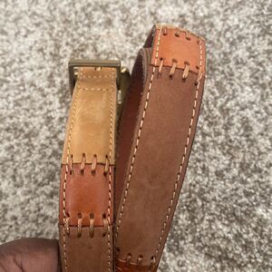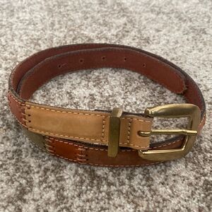 Combined multi-colored patches of leather to form a unique belt. Has a brass buckle.