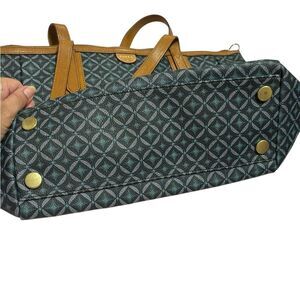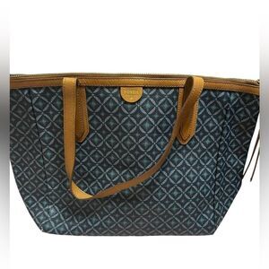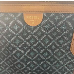 Chic Fossil tote with a black pattern and tan handles. Perfect for daily essentials.
