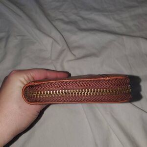 Fossil. Tan with Gold Logo. Large Wallet with 8 designated card slots, plus a pocket behind and in front each card slot and center zip change area. The outside zipper opens and closes smoothly. Leather is free of cracks. There is fading on the back corner, pictured.
