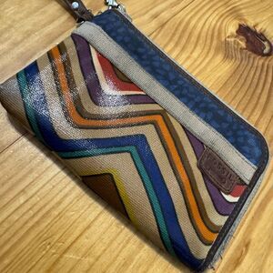This Fossil women's small vinyl zip coin card holder purse features a stylish striped pattern in various colors, with accents of leather. The credit card holder has a zip closure and a convenient strap for easy carrying. Perfect for keeping your coins and cards organized, this purse is a fashionable accessory for women on the go. Made by the reputable brand Fossil, you can trust in the quality and design of this practical yet trendy wallet.