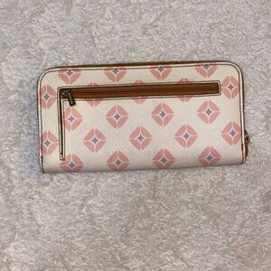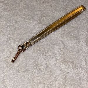 Decent used condition. There’s was a slice on the front from a box cutter when moving so I glued it. The wrist strap disappeared, so I replaced it with a Michael Kors one, as shown and will be included