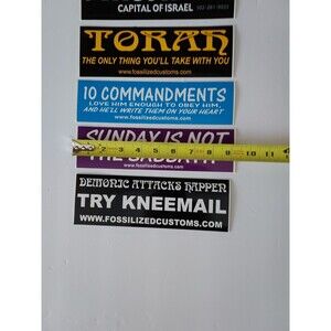 Fossilized Customs Religious Bumper Stickers Decals Lot Of 6 - "Demonic Attacks Happen:Try Kneemail" - "Sunday is not the Sabbath" - "10 Commandments: Love Him Enough to Obey Him, and He'll Write Them on Your Heart" - "Torah: The Only Thing You'll Take With You" - "Jerusalem: Capital of Israel" - "If You Believe There's No Creator, You'd Better Be Right" - Torah: It's Everywhere You're Going to Be" (4-1/2" x 3") - "Torah On Board" (5" x 5" square) - All others are 9" x 3"