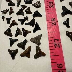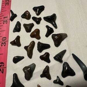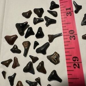 A collection of 70 fossilized shark teeth. Black and some gray in color. Every tooth is uniquely different. Perfect gift for the beach lover and for craft projects.