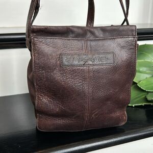 This Stylish and durable brown fossil leather bag is a unisex style and is a dark chocolate brown colored leather. The bag is soft and luxurious to the touch and has beautiful color variations and weathering throughout. The bag has a fossil key attached to the front zipper. That is perfect for your cell phone. The front also has a photo of our snap closing pocket for more organization and the top of the bag has a strong and secure zipper. The Crossbody shoulder strap is in excellent condition and adjustable with a beautiful brass pound buckle detail, allowing you to lengthen or shorten as needed. The shoulder strap drop can have an approximate 24 inch drop. The bag opens to signature fossil lining inside with a center divider and plenty of room for your must have. The inside is clean with 2 ink marks near the inside bottom of the fabric. There is a zipper pocket for organizing and the fossil nameplate inside. This beautiful bag is super soft and luxurious feeling and has intentional distressing throughout. Non-smoking and versatile no matter the season.