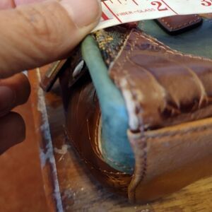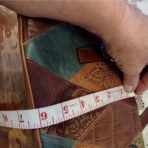 vintage, leather, patchwork, tooled leather shoulder bag. see wear on corners and some staining on bottom. 12x6x3.5"