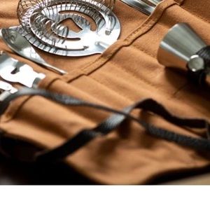 Set of 7 bar tools A portable essential bar setup Convenient canvas roll up for storage Leather closure Our Canvas Cocktail Kit will get any party rollin! Equipped with a jigger, strainer, wood wrap truetap, channel knife/zester, bar spoon, ice tongs, and wood muddler, this kit is made to craft any cocktail on the spot. That's the spirit!