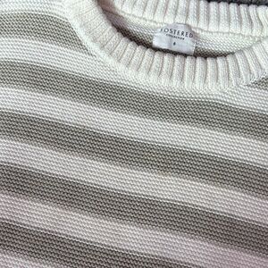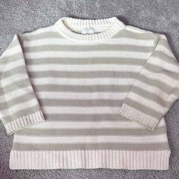 Soft striped knit sweater in cream and beige. Comfortable crew neck and relaxed fit for everyday wear. Lightweight texture layers easily for cooler days. Neutral colors pair well with jeans or skirts.
