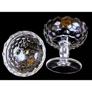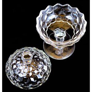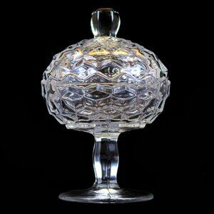 This Fostoria American Clear jelly dish with lid features the iconic cube motif that defines the American pattern. Measuring 6 3/4 inches tall and 4 1/2 inches wide, this piece was originally designed for serving jelly or preserves, though it also functions beautifully as a covered candy dish.