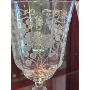Fostoria Midnight Rose, vintage water glasses, etched stemware, Depression glass, collectible Fostoria, 1930s–1950s glassware, vintage floral goblets, weddings, formal occasions, eloquent, chic
