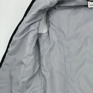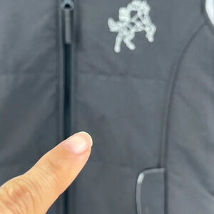 There is a small stain that might come off with some care before wash. See 2nd picture. Otherwise, vest in in GOOD overall preowned condition.