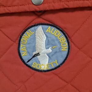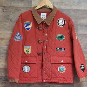 Found Multi patch Jacket Quilted jacket with multiple embroidered patches. Contrast brown corduroy collar and cuff details. Front toggle and snap closures. Casual outdoorsy vibe.