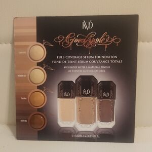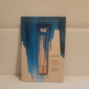Foundation Sampler Cards from Urban Decay, Too Faced, Bobby Brown, and Kat Von Dee.