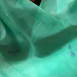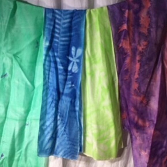 Hand dyed and hand stamped. Gently hand wash and iron with pressing cloth. Outside purple and green scarves are 12"x60" and the inner blue and green are 8"x54"