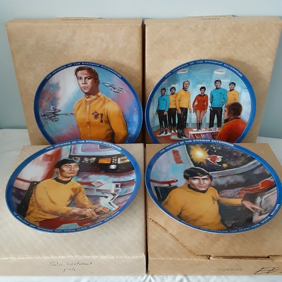 Four Limited Edition by Ernst 1980's Star Trek Collector Plates; Beam Us Down Scotty, Kirk, Chekov, Sulu
