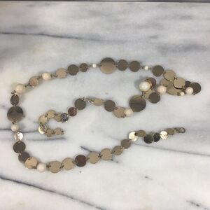 2) A Gold-Tone Disc And Bead Necklace featuring a long chain adorned with alternating gold-colored, coin-linke diss and round, white beads.