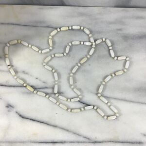 4) A Long, White Beaded Necklace with white beads in elongated and tube shapes.