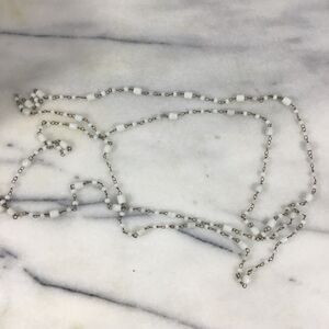 3) A Long, White Beaded Necklace with white beads in elongated and rounded shapes with a lot of chain between each of the beads.