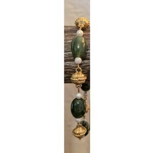 Four Bracelet Lot of Cream Enamel Chain Link Hinged Bangle, Green Stone & More. Pre-owned, these bracelets are in various conditions and sold as is. Cream enamel hinged clamper style oval bangle, green stone, faux pearl and textured bead with spring ring clasp, herringbone chain with fold over clasp, and flower bangle. All gold tone. Wear them individually, mix and match or layer them up!