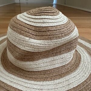 Four Buttons San Diego Hat Co Sun Hat Tan. Tan and cream color stripes alternate on this 10% polyester, 90% paper sun hat. Wide, 4 1/2" brim to protect face and ears from the sun. 5" crown. Pictures show indentation to crown but when worn there's no sign of "collapse." Excellent, clean condition. Fiber is pulled in one spot near the brim's edge (see last pic.). Packable, stylish accessory for the beach, pool or any outdoor activity.