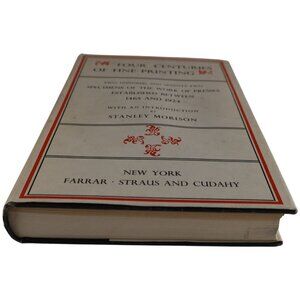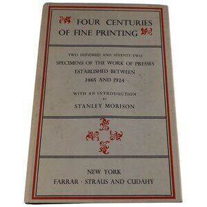 A classic survey of typography and book design, this 1957 third revised octavo edition of Four Centuries of Fine Printing gathers 272 representative specimens from presses founded between 1465 and 1924, with an introduction by Stanley Morison. It’s a handy reference for designers, printers, book historians, and anyone who likes seeing how type, page layout, and illustration evolved from early incunabula through the private-press revival. This copy is hardcover with its dust jacket present; the jacket shows rubbing and edge wear consistent with age. Interior pages are clean on a quick flip, with light toning; pencil notes appear on the front blank endpaper. Title page states Farrar, Straus and Cudahy, New York; prelims note “Printed in Great Britain” and “Third (revised, octavo) edition, 1957.” A solid working and reference copy with the visuals people actually use these for.