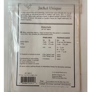 Four Corners Reversible Jacket Sewing Craft FC1011 Size S - XL Uncut Complete Factory Fold