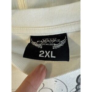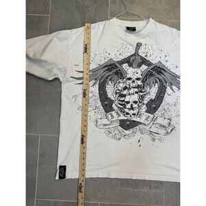 Elevate your streetwear game with the edgy and stylish Four Fatherz Winged Skull And Dagger Y2K Hip Hop White T-Shirt in size XXL. This unisex graphic tee combines elements of horror and hip hop for a bold and unique look.