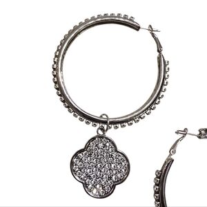 Four Leaf Earrings Silver Large Hoop Rhinestone Crystal Dangle 2"