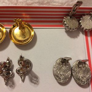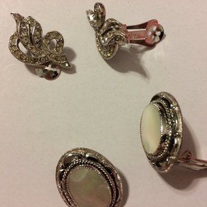 Two pairs of Judy Lee clip ons (5th pic): one pair of pinkish/clear cabochon stone earrings, one pair of round silver mother-of-pearl type stones. One pair of gold tone Marino pearl-type stones in pronged setting. One pair of Leido silver swirl ribbon-type rhinestone earrings (looks like one is missing a rhinestone). All signed.