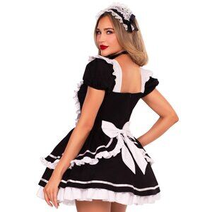 4-Piece Flirty Maid Set: Includes ruffle-trimmed dress with lace-up bodice and tiered skirt, pin-on back bow, cameo choker, and matching headband