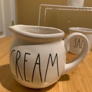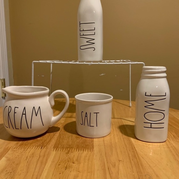 Rae Dunn Two Bottles “Sweet “ Approximately 7 1/2. “ “Home “Approximately 6”. “Salt” Approximately 3 3/4”. Cream Approximately 4”. No Bundles Please