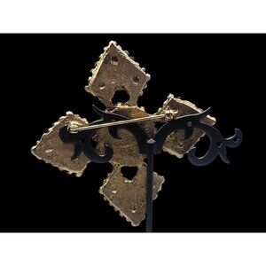 This Four Point Dotted Cross Brooch in gold tone features large, blue, faceted rhinestones. It exudes elegance and sophistication, perfect for accessorizing any outfit.