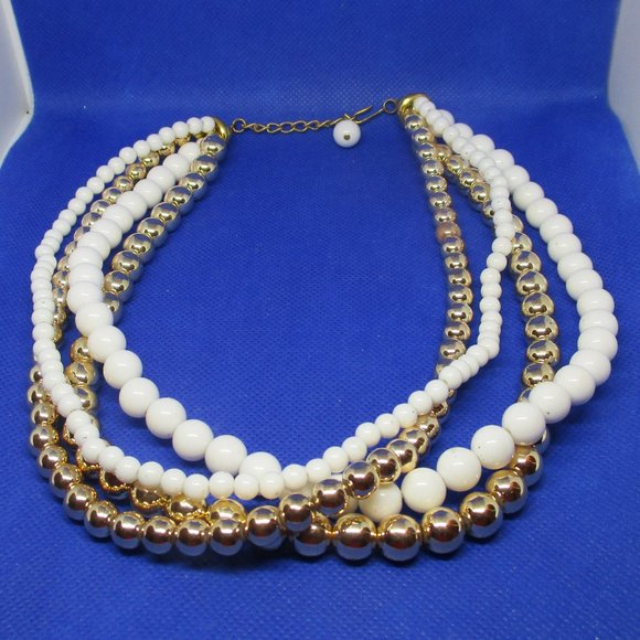 Never worn metallic gold tone and white four-strand beaded necklace with a gold-tone metal extension chain with a white end bead. This necklace is in new never worn condition with the exception of one metallic gold-tone bead where some of the gold tone is rubbing off which is only noticeable on close inspection. This necklace is priced accordingly.