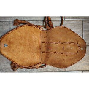 This unique Four Winds Leather crossbody purse features a beautiful Hamsa embellishment and a braided strap, perfect for boho and hippie styles. Ideal for adding a touch of charm to any outfit. It measures 12" in width at its widest and 11" in height at its longest with an adjustable strap. It is vintage so it does have stray markings. Please see all photographs as the are part of the description. Shipped with USPS Ground Mail.