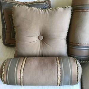 Four pillows: two square decorative pillows and two neck rolls. Various colors of brown with a braid trim.