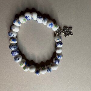 Four delicate stretch bracelets made of ceramic beads decorated with intricate floral patterns. Each bracelet features a unique color theme and coordinating charm. The overall style is elegant and vintage-inspired, reminiscent of hand-painted porcelain.