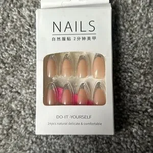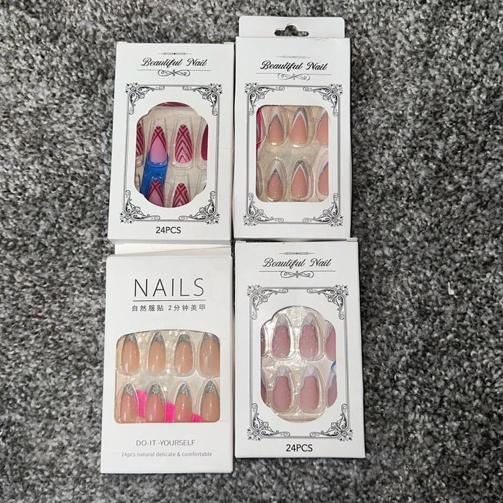 Four nail sets! They are press or glue on. Stay on for 2 weeks when applied correctly. Almond shaped and medium length.