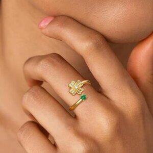 #BirthstoneRing #FourLeafClover #EmeraldRing #GoldJewelry #LuckyRing #AdjustableRing #MayBirthstone #GiftForHer #GoodLuckCharm #StackableRings