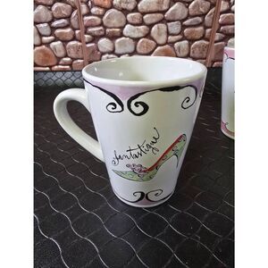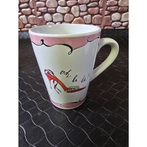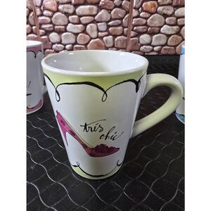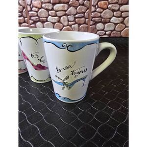 Each mug features a different high-heeled shoe design and a French phrase.The phrases include "tris chic," "oh la la!" "lamour toujours," and "Santastique". These mugs are part of Rosanna's collection, known for its stylish and decorative designs.