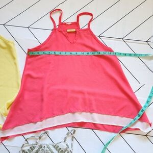 Set of four sleeveless tops in vibrant colors and patterns. Perfect for casual wear; different brands, about a girl. RNB and Sweet Lala.