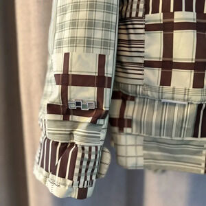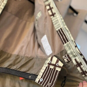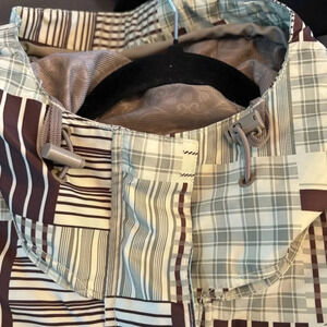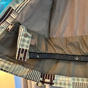 Foursquare Snow Board Outerwear 5K Hooded Jacket. Women's Size M. Green and Brown Patchwork Plaid. Inside button snap in system with lots of pockets. Inside and outer pockets with key clip and pass holder. Velcro and front zipper closure. Side zipper pockets and front Velcro pockets and cuffs. Wired earbud straps. Inside fleece lining. Extra buttons. Adjusting cinch straps.